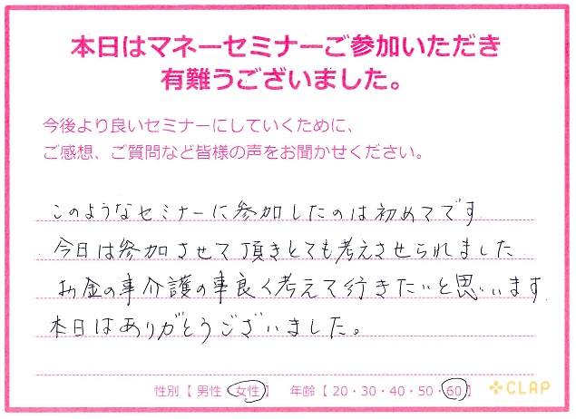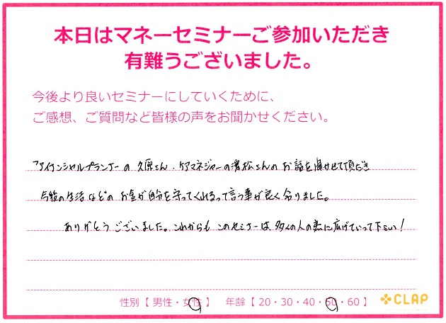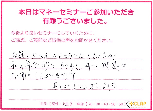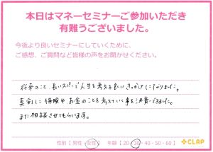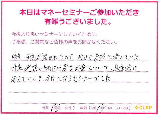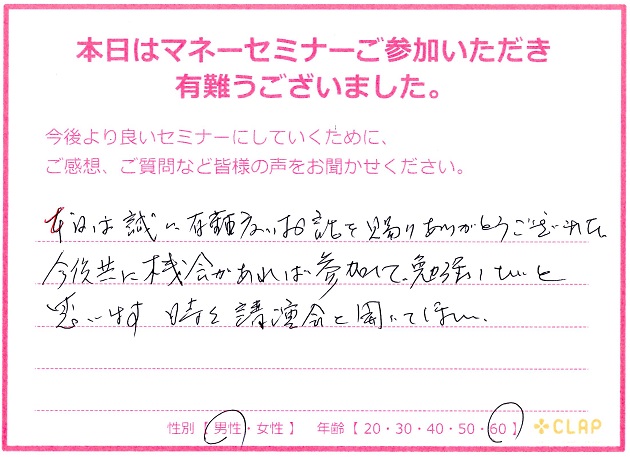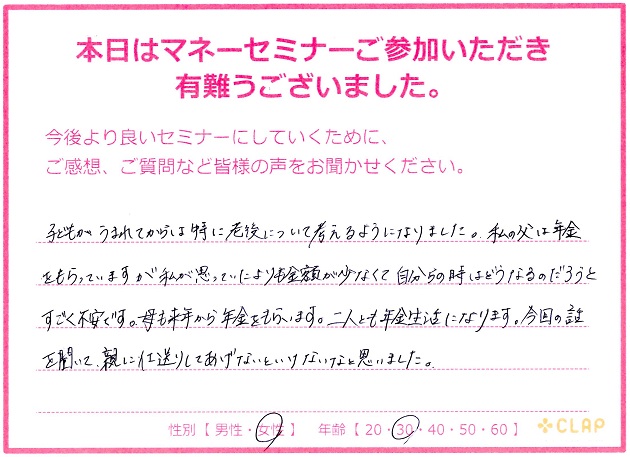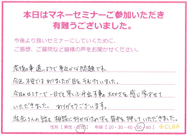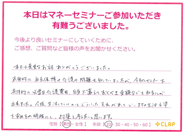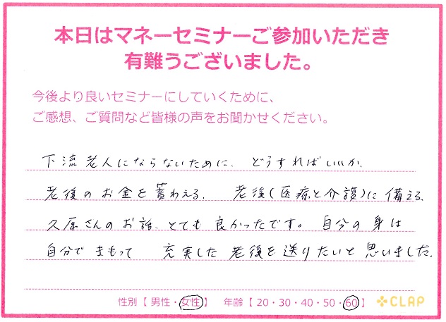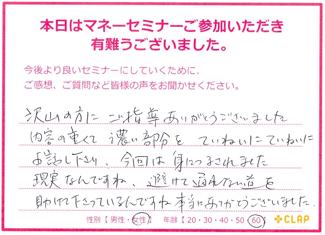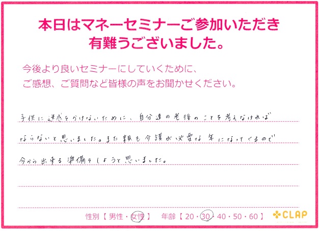 西宮市後援・市政ニュース掲載講座『医療×年金×介護 老後破産しないためのマネーセミナー』 投稿日 2017年11月23日 カテゴリー イベント情報 カテゴリー 未来の安心 カテゴリー 老後資金 11月23日 西宮市後援・市政ニュース掲載講座 『医療×年金×介護 老後破産しないためのマネーセミナー』が無事終了いたしました。 予定人数を超えるたくさんの方々に聞いていただくことができました。 このセミナーが未来の自分や家族を守るための一歩に繋がれば幸いです。 お越しいただいた方々、サポートしていただいた方々、本当にありがとうございました。