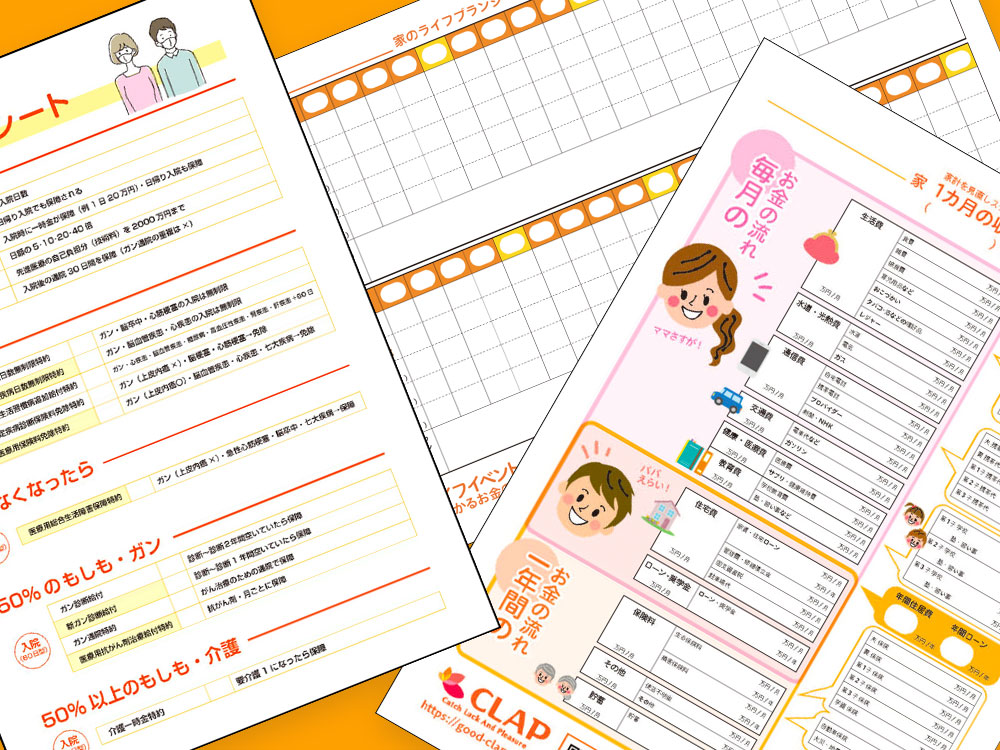 CLAPでは、ご家庭の、お金に対する不安や心配をなるべく減らすため、お役にたてる「お金に関してチェックできる資料」を無償で公開しています。ダウンロードしてプリントアウトすれば、自由にお使いいただけます。