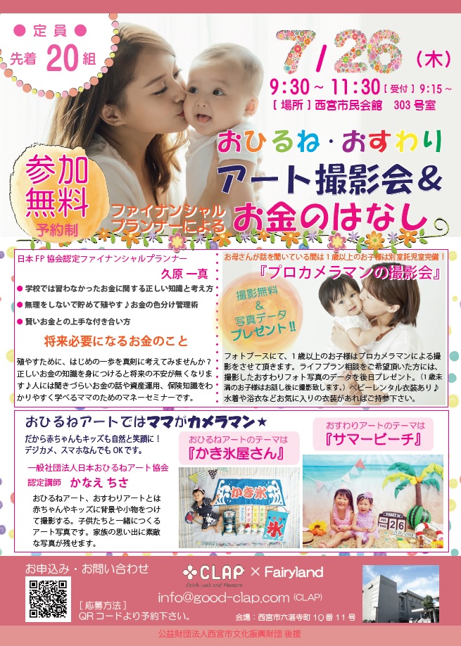 ■ 7月26日(木) おひるね・おすわりアート撮影会 & ファイナンシャルプランナーが教える お金のはなし 投稿日 2018年7月26日 カテゴリー イベント情報 カテゴリー お客様の声 ■7月26日 公益財団法人西宮市文化振興財団 後援 『おひるね・おすわりアート撮影会 & ファイナンシャルプランナーが教える 子育てママが知っておきたいお金のはなし』は 無事終了致しました。 ■セミナー風景 ■おひるね・おすわりアート撮影会
