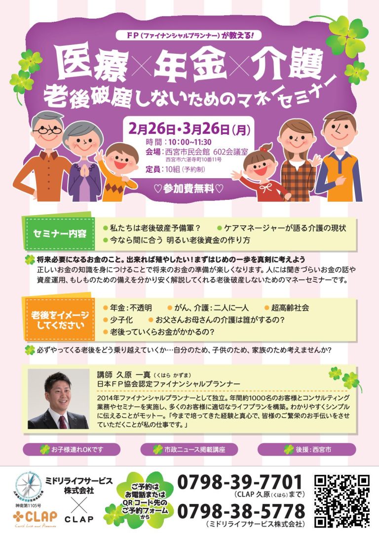 11月23日 西宮市後援・市政ニュース掲載講座 『医療×年金×介護 老後破産しないためのマネーセミナー』が無事終了いたしました。 予定人数を超えるたくさんの方々に聞いていただくことができました。 このセミナーが未来の自 […] -