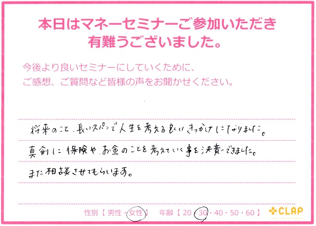 本日のマネーセミナー。 同じ職場のお二人と将来について話し合いました。 今を楽しんでいるお二人が、何年か後の未来の自分が今と同じ笑顔でいられるようにしっかり計画を立てました。 -